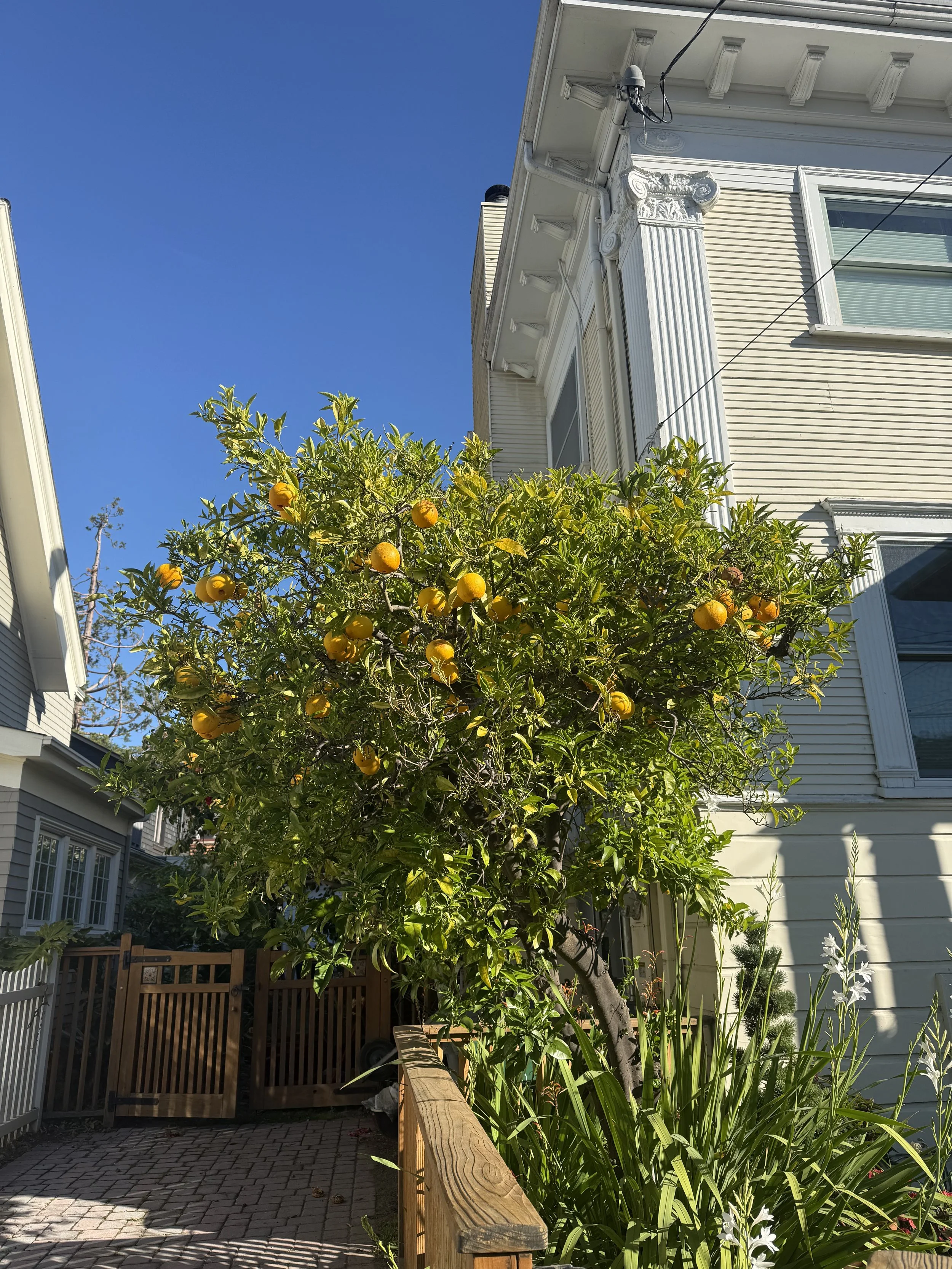 Twice a year, I assess the progress of the garden. At this point, I have been gardening at the same house in Berkeley for 40 years. Some plants, like the small orange tree and the tall camellias, were here when we bought the house. The oranges are not very sweet, despite my efforts. I have been told that our summers are not really warm enough to grow sweet navel oranges. I deep water, I fertilize. Last year an arborist thinned the branches so that the shape is elegant and sun can reach every orange globe. It looked festive at Christmas time, but the taste is still meh. Yes, I can make marmalade, but the fact is no one but me will eat marmalade, and everyone is cutting back on sugar. But I would not sacrifice such a plucky survivor.